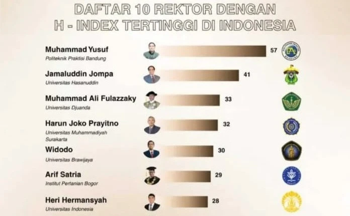 Dikutip dari jatinangor.com, dalam daftar tersebut, Muhammad Yusuf dari Politeknik Praktisi Bandung berada di posisi teratas dengan H-index 57.
