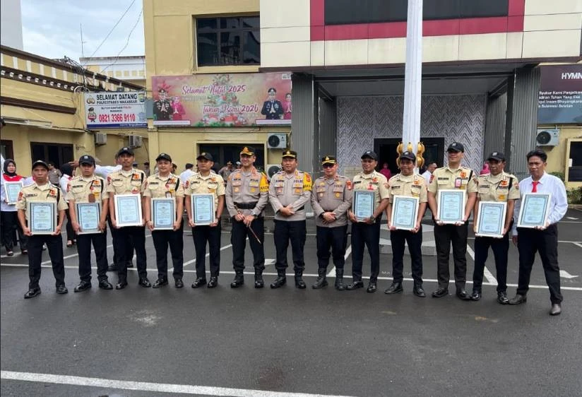 MAKASSAR, UNHAS.TV - Kapolrestabes Makassar Kombes Polisi Arya Perdana SH SIK MSi memberikan penghargaan kepada Sebanyak 12 anggota Satuan Pengamanan Universitas Hasanuddin (Satpam Unhas) di Kantor Polrestabes Makassar, Selasa (30/12/2025).
