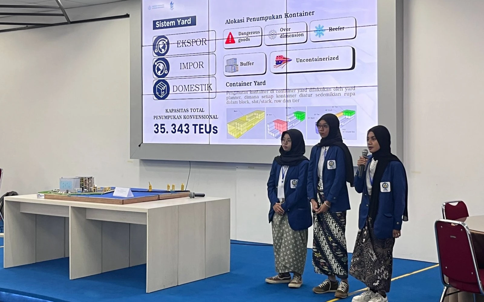 HIGH BAY STORAGE. Tim The Moses dari Institut Teknologi Sepuluh Nopember (ITS) mempresentasikan inovasinya pada kategori Ocean Port Design Competition (OPDC) pada event Oceania 2025 yang berlangsung di Fakultas Teknik Unhas, Gowa, Jumat (24/10/2025). Inovasi mahasiswa ITS, keluar sebagai juara melalui inovasi High Bay Storage (HBS)—sistem penyimpanan petikemas vertikal berbasis teknologi digital dan energi surya yang dinilai efisien serta ramah lingkungan. (dok oceania 2025)