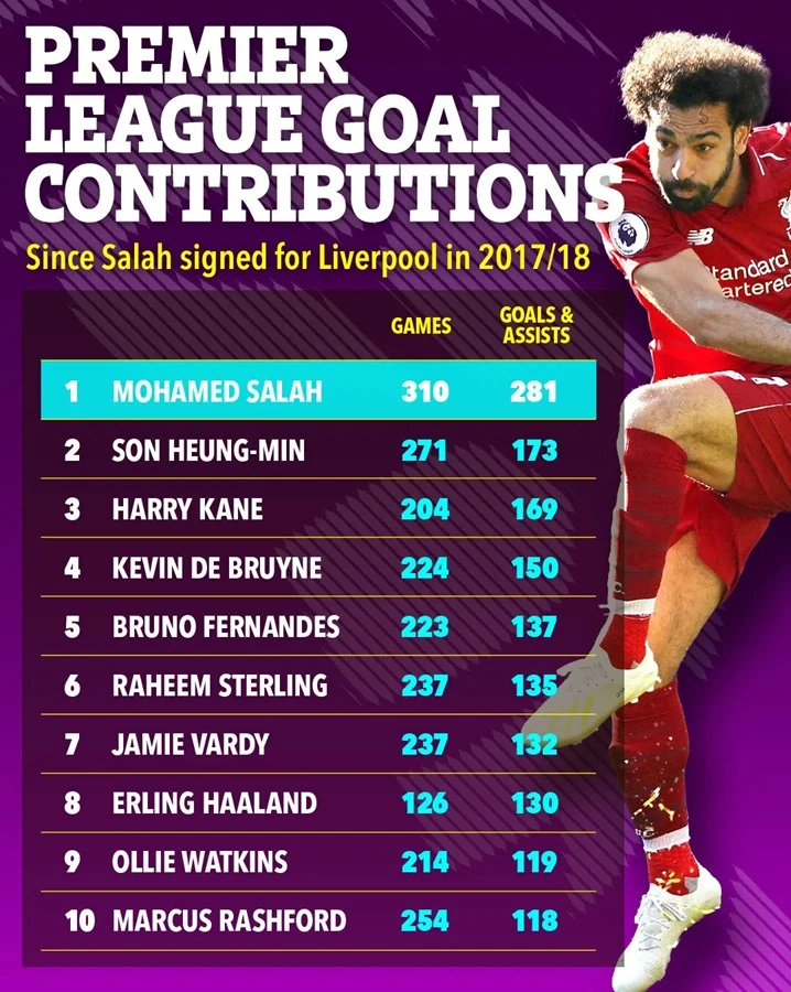 Salah telah mencetak 189 gol dari total 310 pertandingan Liga Premier untuk The Reds, dengan 92 assist.
