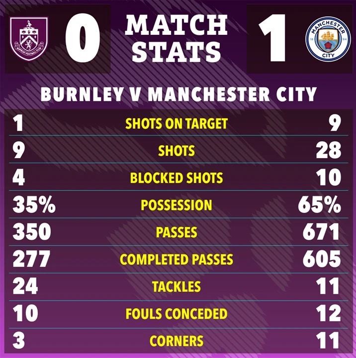 Staitistik Pertandingan Burnley vs Man City. (The Sun)