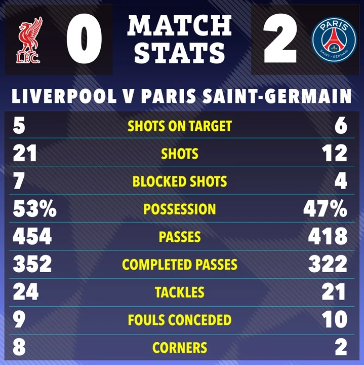 Statistik Pertandingan Liverpool vs PSG. (The Sun)