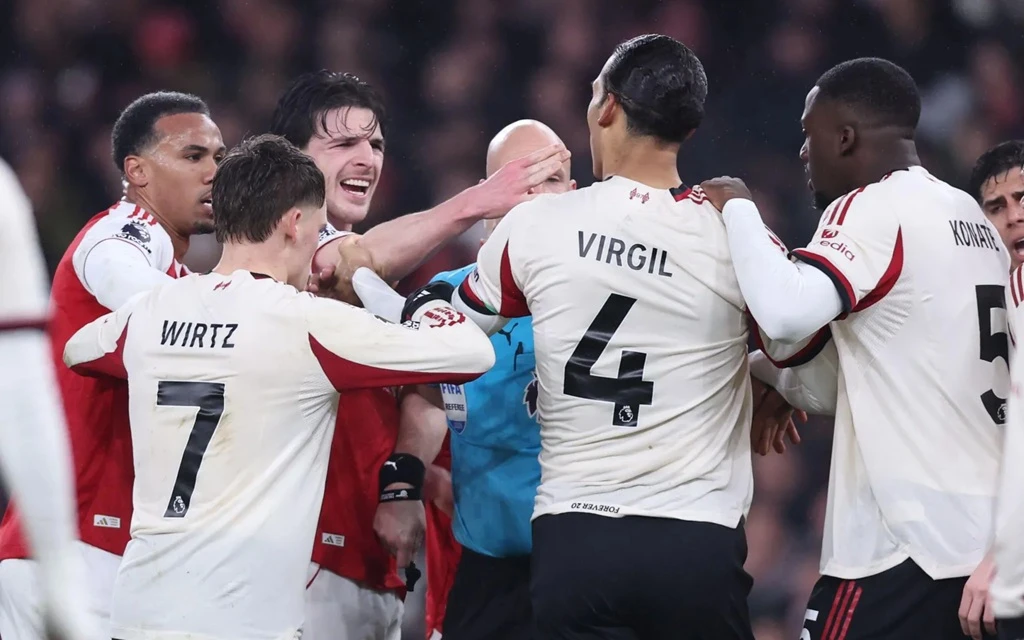 Pemain Arsenal Declan Rice terlibat perseteruan dengan bek Liverpool Virgil van Dijk dalam laga lanjutan Liga Inggris di Stadion Emirates, Kamis (8/1/2026) malam. (screenshot the sun)