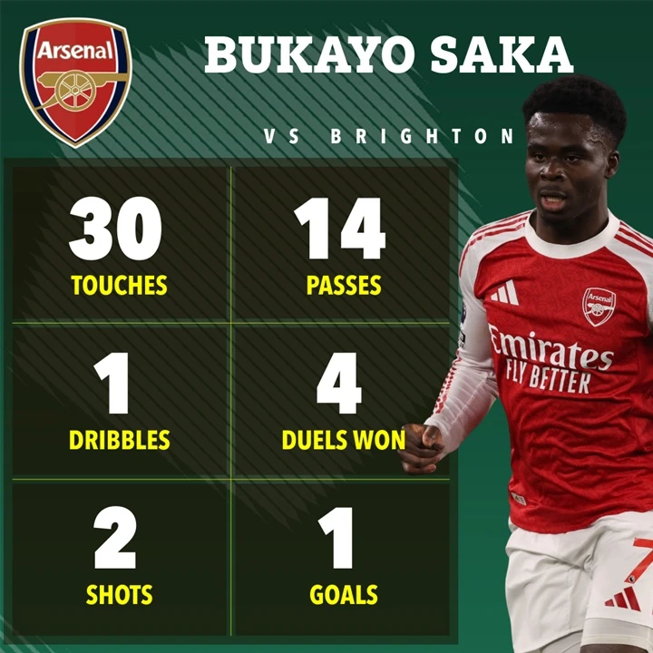 Gol tersebut bermula dari situasi di tepi kotak penalti. Saka melepaskan tembakan mendatar yang membentur Baleba dan mengecoh kiper Bart Verbruggen.