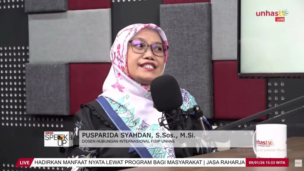 Dosen Hubungan Internasional FISIP Unhas Pusparida Syahdan saat tampil dalam program Unhas Speak Up. (dok unhas tv)