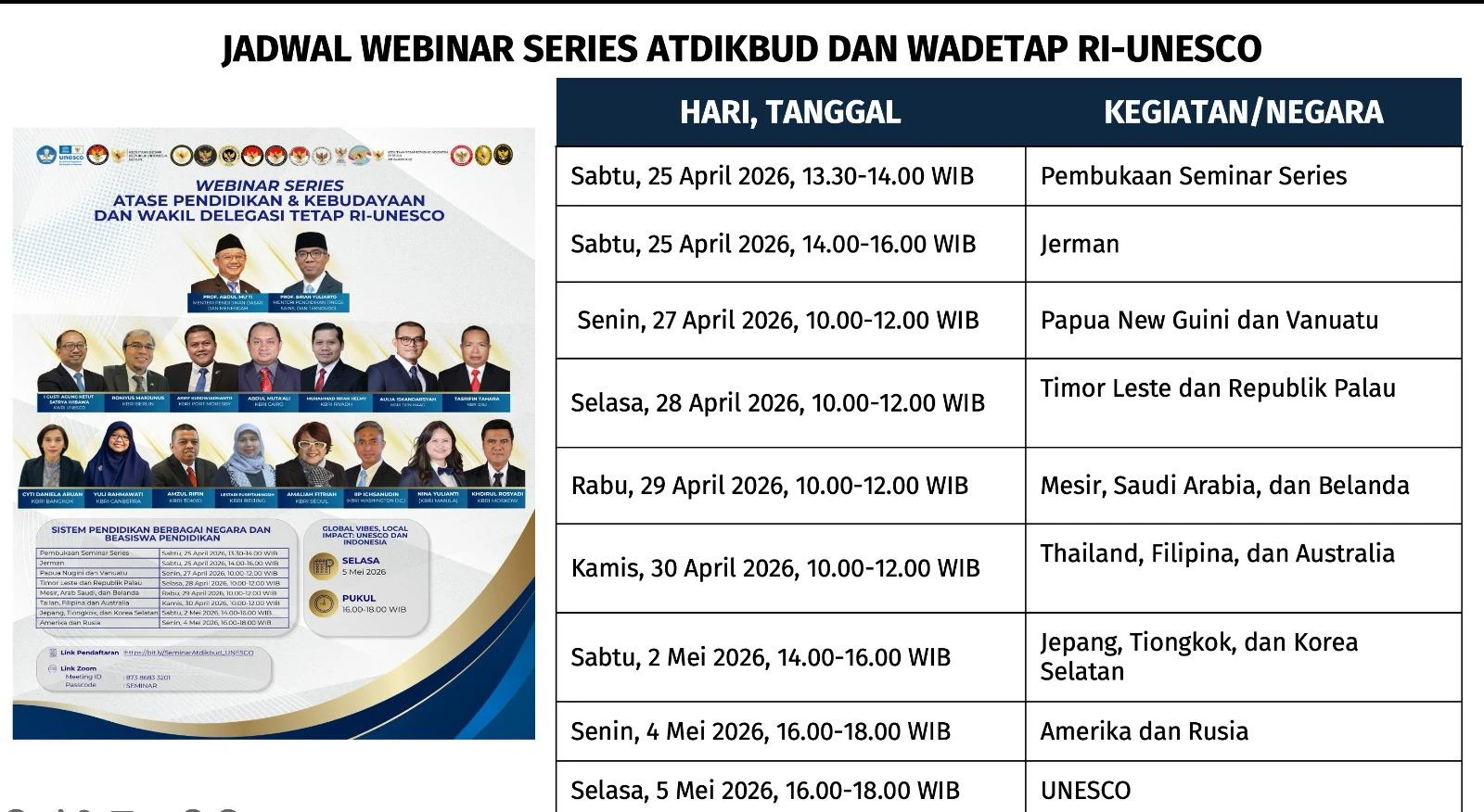 JAKARTA, UNHAS.TV - Upaya memperluas akses informasi pendidikan global dan memperkuat jejaring internasional kembali diperlihatkan melalui penyelenggaraan Webinar Series Atdikbud dan Wadetap RI–UNESCO Tahun 2026.
