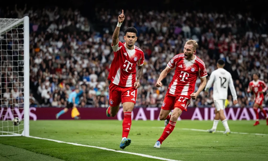 GOL PEMBUKA - Striker Luis Diaz mencetak gol pembuka untuk Bayern Munich di kandang Real Madrid, Rabu (8/4/2026) dini hari. (The Sun/Getty)