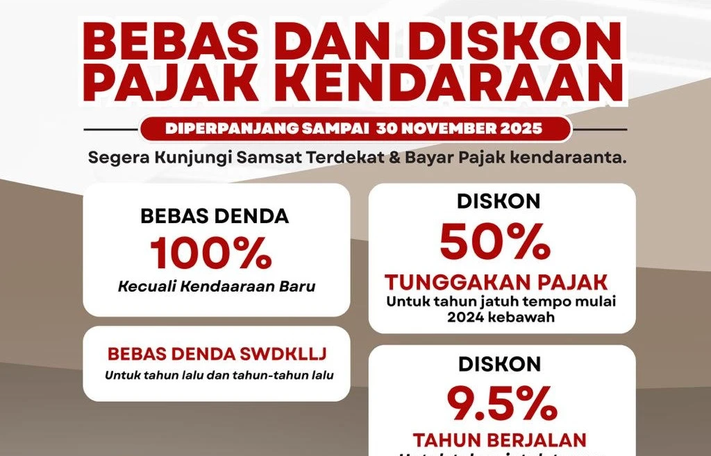 Untuk kendaraan tahun berjalan, diberikan diskon 9,5 persen untuk pajak yang jatuh tempo pada 2025.