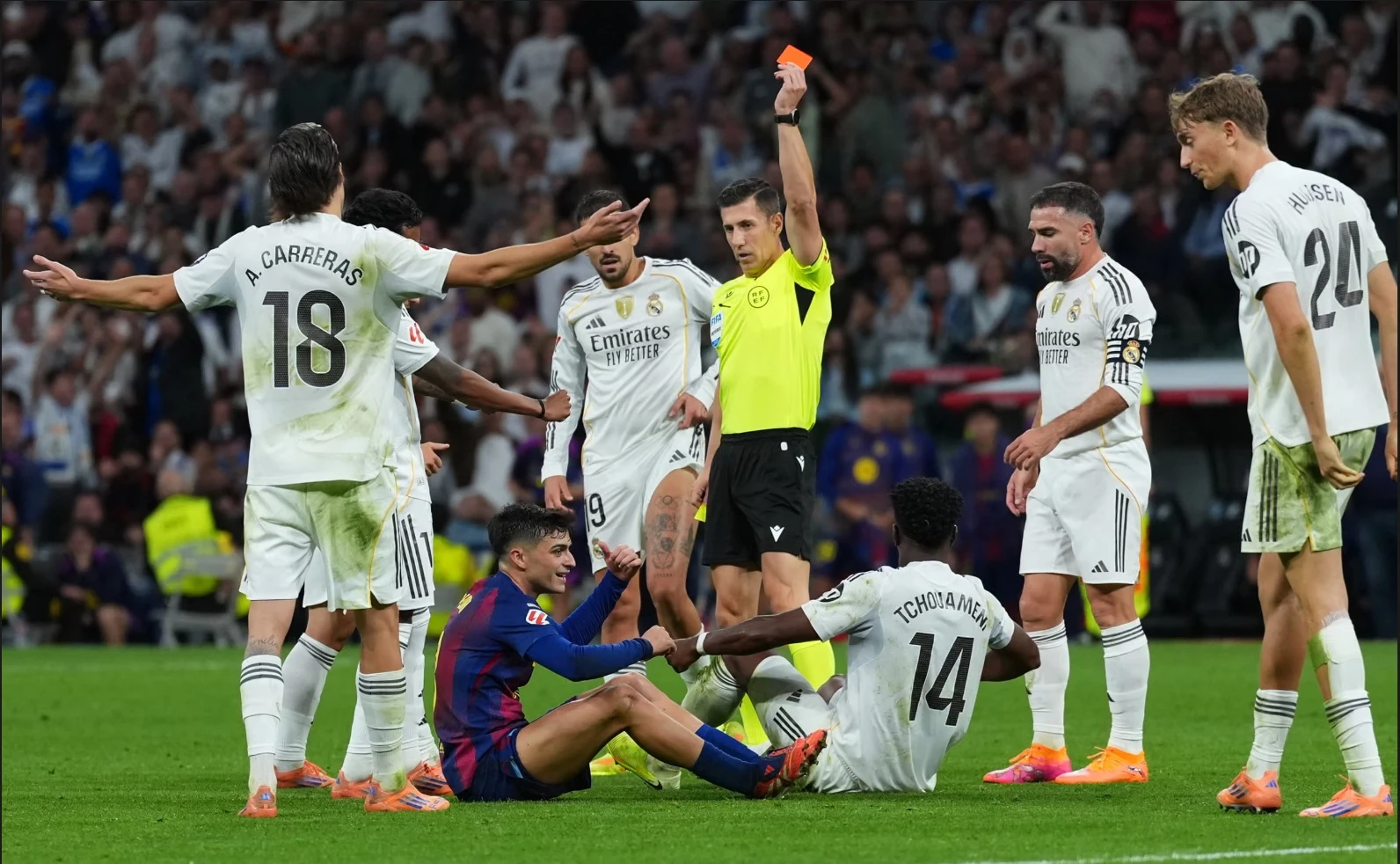 KARTU MERAH. Kapten Barcelona Pedri dikerubuti pemain Real Madrid yang akhirnya mendapat kartu merah di laga el clasico yang berlangsung di Stadion Santiago Bernabeu, Madrid, Senin (27/10/2025) dini hari.