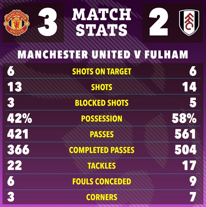 Setelah gol pembuka, performa United menurun. Permainan melambat, intensitas menurun. Fulham nyaris menyamakan kedudukan lewat sundulan Joachim Andersen yang ditepis kiper Senne Lammens.