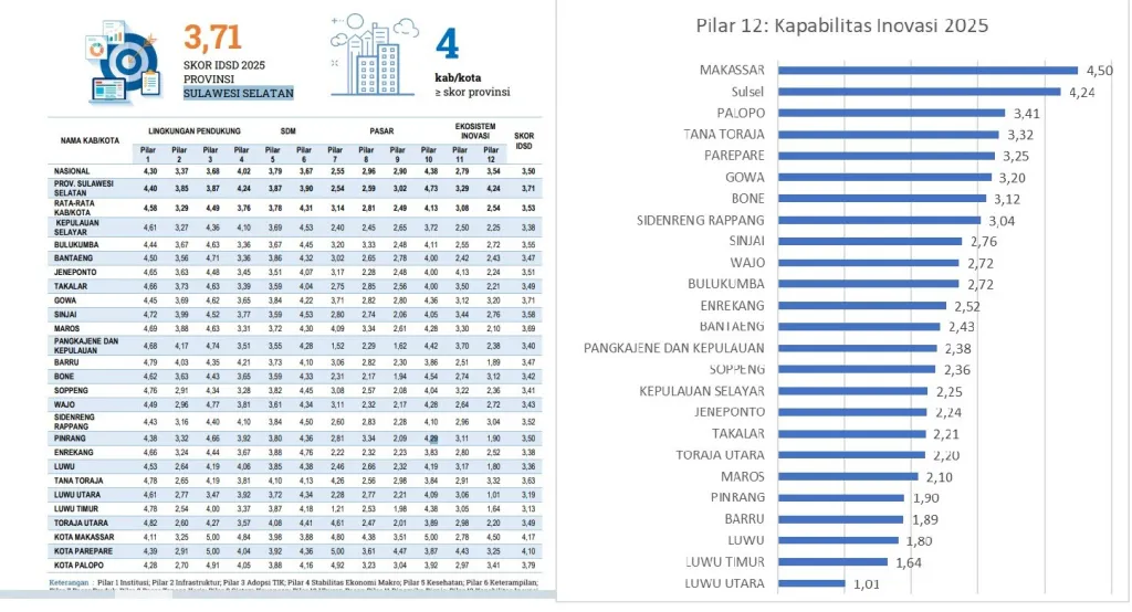 Capaian tersebut juga lebih tinggi dibandingkan skor Sulawesi Selatan yang berada di angka 3,71. Posisi ini menempatkan Makassar sebagai salah satu daerah dengan performa daya saing kuat di tingkat nasional.