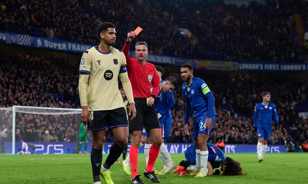 Stamford Bridge bergemuruh. Barcelona semakin kehilangan kendali setelah sang kapten, Ronald Araujo, mendapat kartu kuning kedua akibat tekel sembrono pada Cucurella.