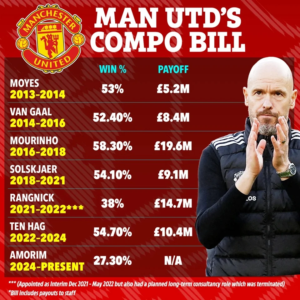 Beserta staf kepelatihannya dan Ruud van Nistelrooy yang sempat menjadi caretaker, kompensasi yang dibayar United menembus £10,4 juta.