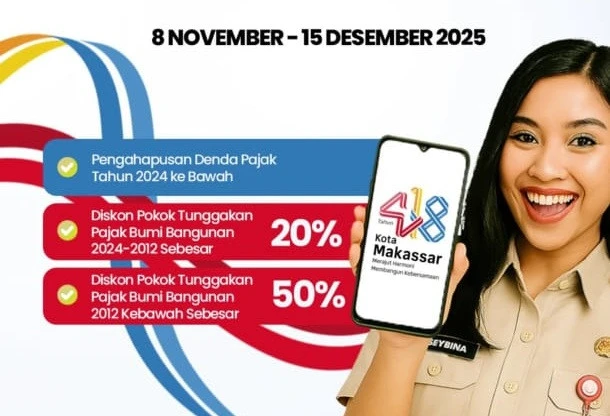 MAKASSAR, UNHAS.TV - Bagian dari perayaan Hari Jadi ke-418 Kota Makassar, Badan Pendapatan Daerah (Bapenda) Kota Makassar memberikan program “Diskon Pajak dan Penghapusan Sanksi Administratif” yang berlangsung mulai 8 November hingga 15 Desember 2025.