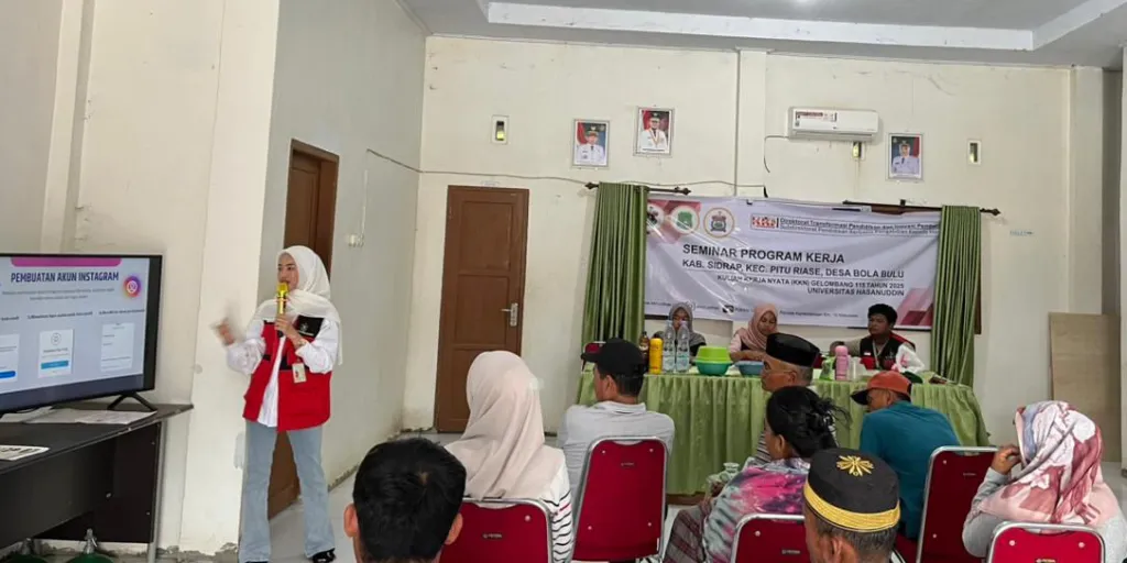 EKODIGITAL. Mahasiswa KKN Tematik Unhas laksanakan program Ekodigital berupa Pelatihan Melalui Media Sosial untuk Pelaku UMKM di Kantor Desa Bola Bulu, Kecamatan Pitu Riase, Kabupaten Sidenreng Rappang, Jumat (23/1/2026). (dok Alfia Sindhy Pratiwi)