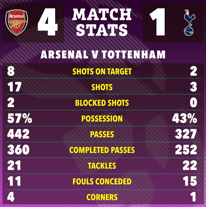 Statistik pertandingan saat Arsenal menekuk Tottenham Hostpurs dengan skor telak 4-1. (screenshot the sun)