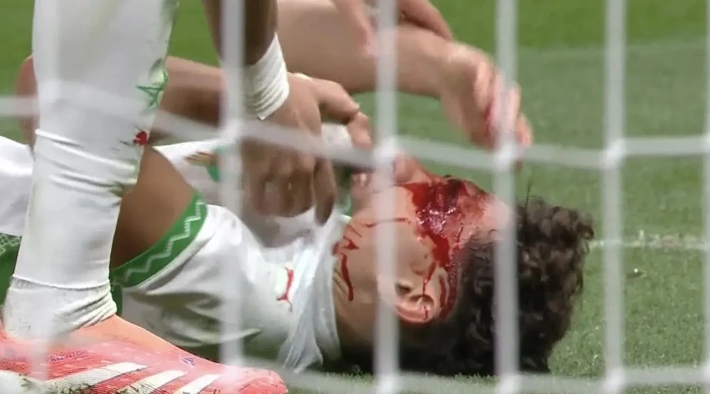 Pemain Moroko Neil El Aynaoui berlumuran darah setelah berbenturan dengan El Hadji Malick Diouf. (the sun)