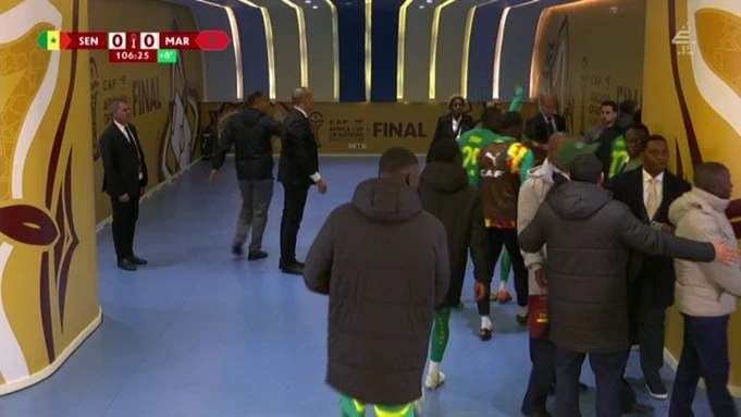 Sebagian besar skuad Senegal berjalan menuju lorong ruang ganti. Maroko, dipimpin Achraf Hakimi, tetap berdiri di tengah lapangan, kebingungan menyaksikan lawan mereka menolak melanjutkan pertandingan.