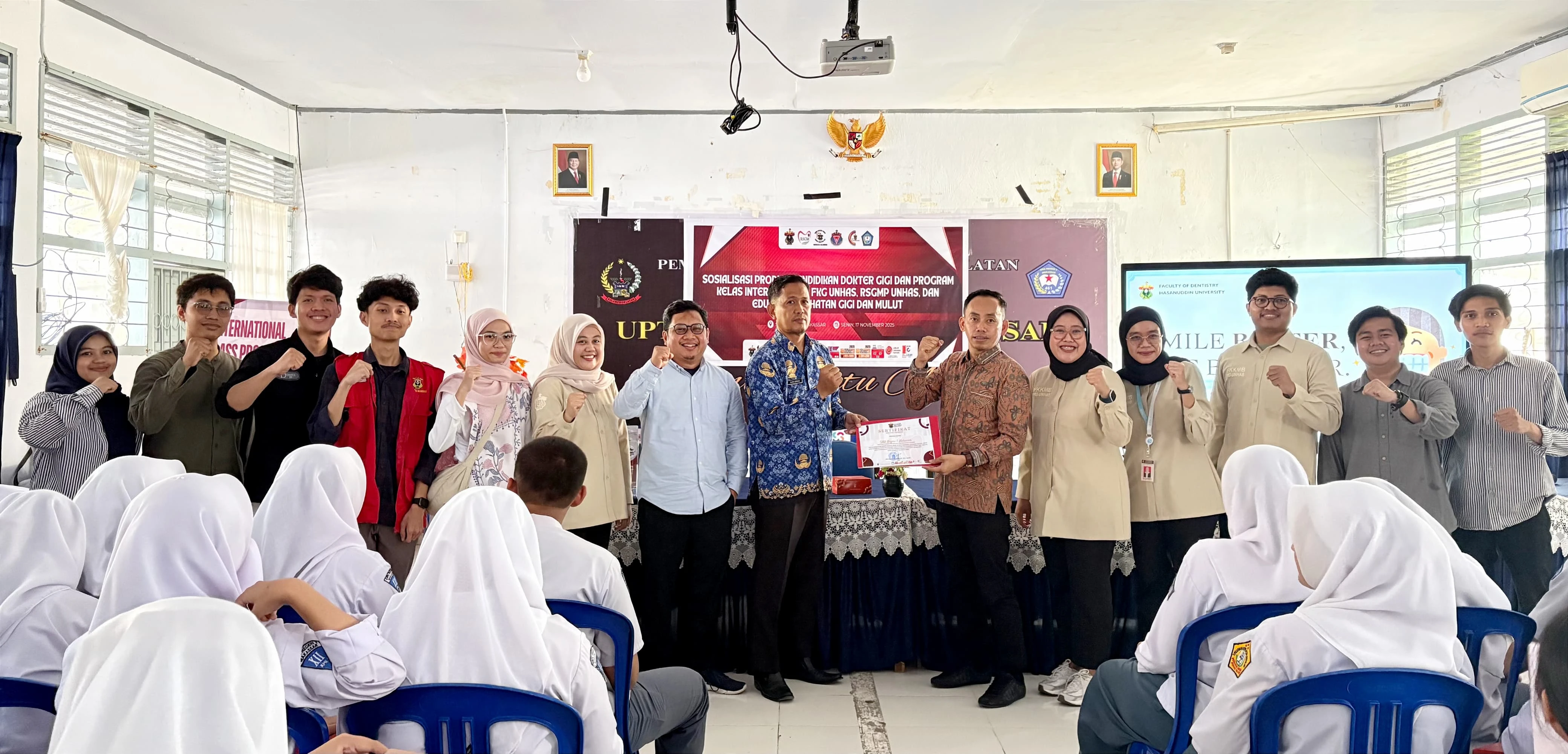 MAKASSAR, UNHAS.TV-Fakultas Kedokteran Gigi (FKG) Universitas Hasanuddin (Unhas) menggelar kegiatan sosialisasi Program Pendidikan Dokter Gigi (S1) dan Program Kelas Internasional, serta penyuluhan kesehatan gigi dan mulut di SMA Negeri 5 Makassar pada Senin, 17 November 2025.