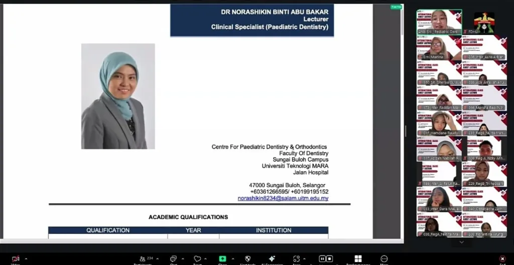 Dalam paparannya, Dr. Norashikin menjelaskan Preventive and Interceptive Orthodontic for Children merupakan pendekatan penting dalam kedokteran gigi anak yang berfokus pada pencegahan dan penanganan dini kelainan pertumbuhan gigi serta rahang.