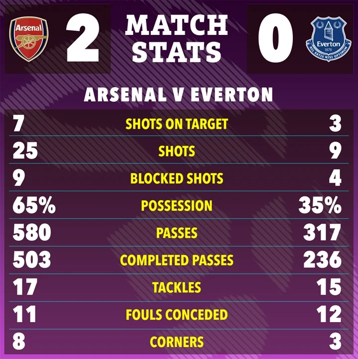 Statistik Pertandingan Arsenal vs Everton. (The Sun)