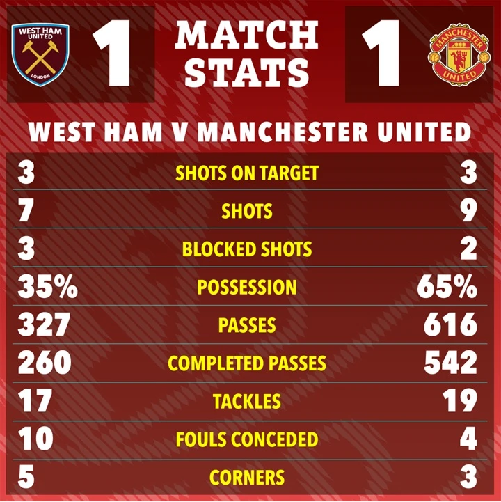 Statistik pertandingan antara West Ham vs Man United. (the sun)