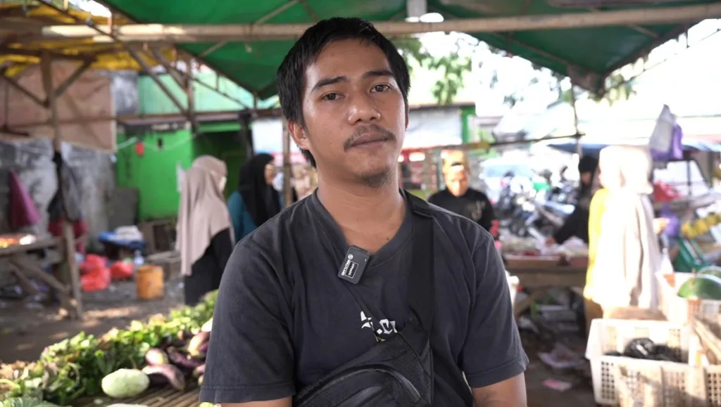 Riswandi, pedagang sayur dan buah di depan Masjid Al Latif, Jl Perintis Kemerdekaan XVII, Makassar, Selasa (10/3/2026)