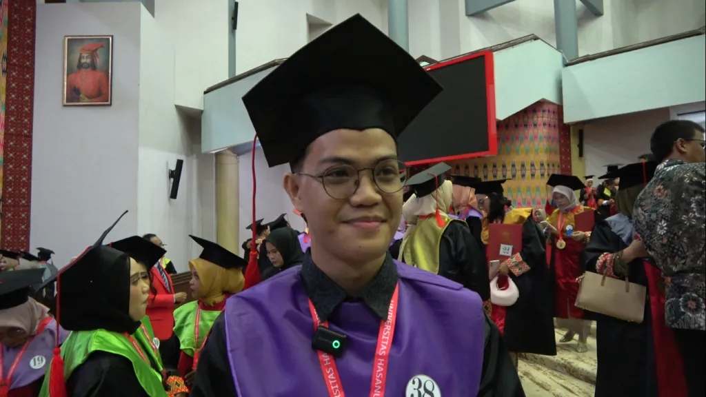 Wisudawan terbaik FKM Unhas, Muh Fauzan Idha, berhasil menyelesaikan studi tanpa skripsi dan lulus dengan IPK 3.93 predikat Cum Laude. Ia jadi lulus terbaik lewat torehan medali emas pada PIMNAS ke 37 di Universitas Airlangga. (dok unhas tv)