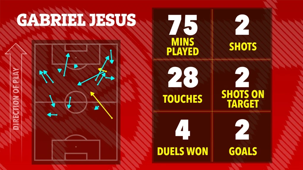 Jesus mencatatkan total 28 sentuhan, memenangkan empat duel, serta menciptakan dua peluang bagi rekan setimnya.