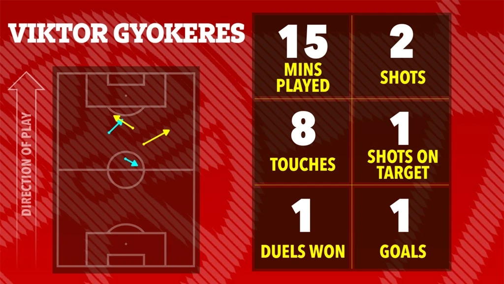 Sebaliknya, Gyokeres mencatatkan delapan sentuhan selama berada di lapangan, memenangkan satu duel, dan melepaskan dua tembakan.