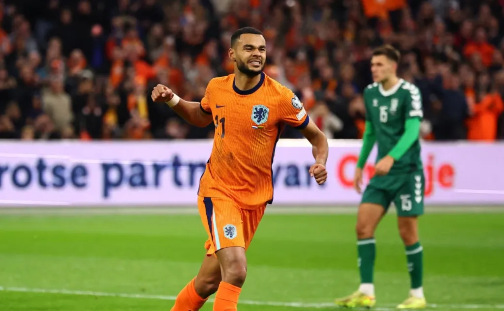 Cody Gakpo menikmati momen saat mencetak gol ke gawang Lithuania di laga terakhir babak kualifikasi, Selasa (18/11/2025). Foto: Piroschka Van De Wouw/Reuters
