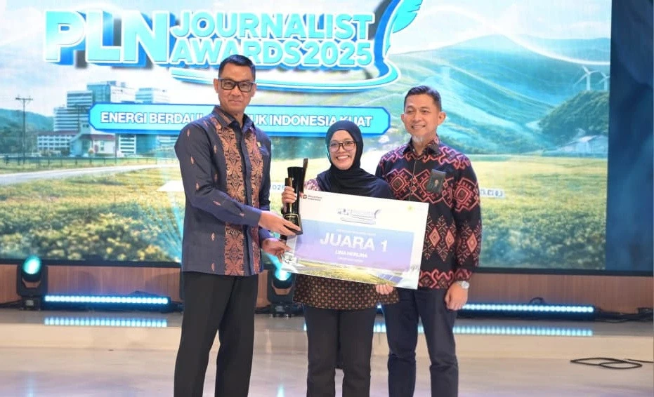 JUARA - Direktur Utama PLN, Darmawan Prasodjo (kiri) menyerahkan penghargaan untuk Jurnalis asal Makassar, Lina Herlina dari Media Indonesia (tengah) didampingi oleh GM PLN UID Sulselrabar, Edyansyah (kanan) di Auditorium Kantor PLN Pusat, Jakarta pada Kamis (26/2). Lina menyabet penghargaan sebagai Juara 1 PLN Journalist Awards 2025 kategori Teks Hard News. (Dok PLN UID Sulselbar)