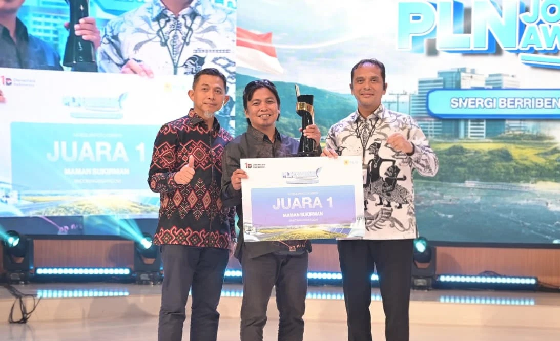 JUARA FOTO - EVP Komunikasi Korporat PLN, Gregorius Adi Trianto (kanan) didampingi oleh GM PLN UID Sulselrabar, Edyansyah (kiri), menyerahkan penghargaan untuk Jurnalis sindomakassar.com, Maman Sukirman (tengah) di Auditorium Kantor PLN Pusat, Jakarta, Kamis (26/2/2026). Maman menyabet Juara 1 PLN Journalist Awards 2025 kategori Foto Cerita. (dok PLN UID Sulselrabar)