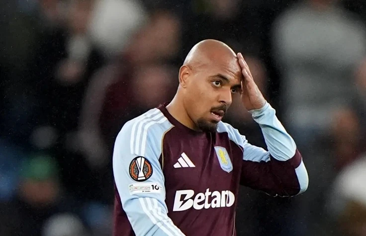 Striker Aston Villa Donyell Malen memegang kepalanya yang terluka akibat terkena lemparan botol suporter Young Boys di Stadion Villa Park, Birmingham, Kamis (27/11/2025) malam. (screenshot the sun)