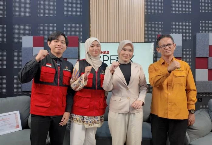 BENCANA - Kepala Pusat Studi Kebencanaan Unhas Dr Ilham Alimuddin bersama mahasiswa peserta KKN Tematik saat berada di Unhas TV. Foto: Unhas TV