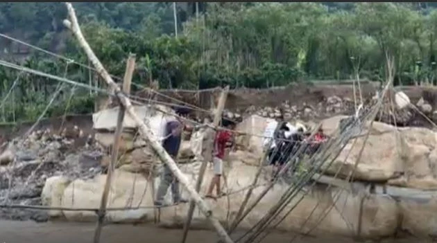 Adrenalin tim diuji ketika harus menyeberangi sungai deras setinggi 6 meter hanya dengan menggunakan jembatan bambu darurat dan seutas tali sling sebagai pegangan—tanpa pengaman tambahan.