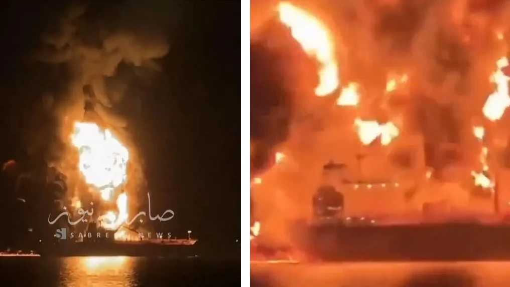 Kapal Tanker terbakar dahsyat di perairan Irak setelah terkena drone, Selasa (10/3/2026). (the sun)