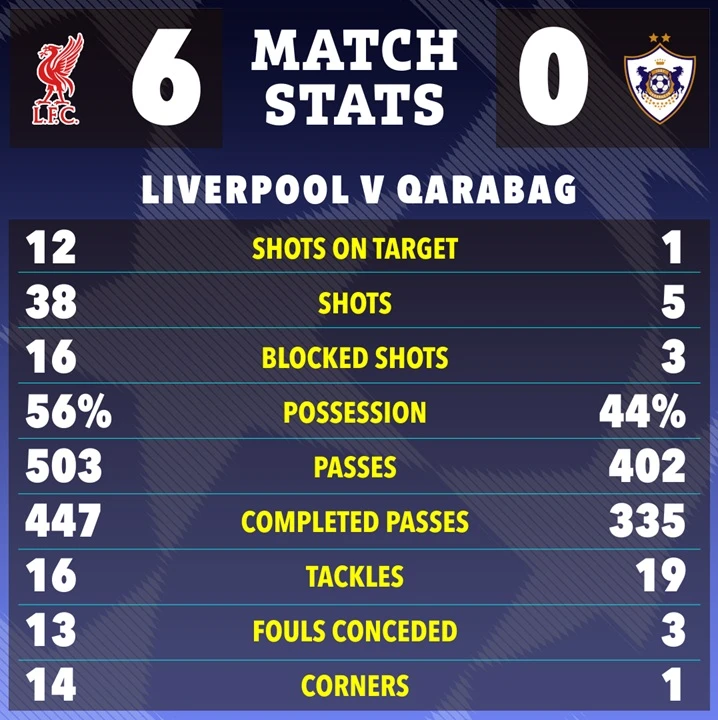 Statistik pertandingan Liverpool vs Qarabag. (the sun)