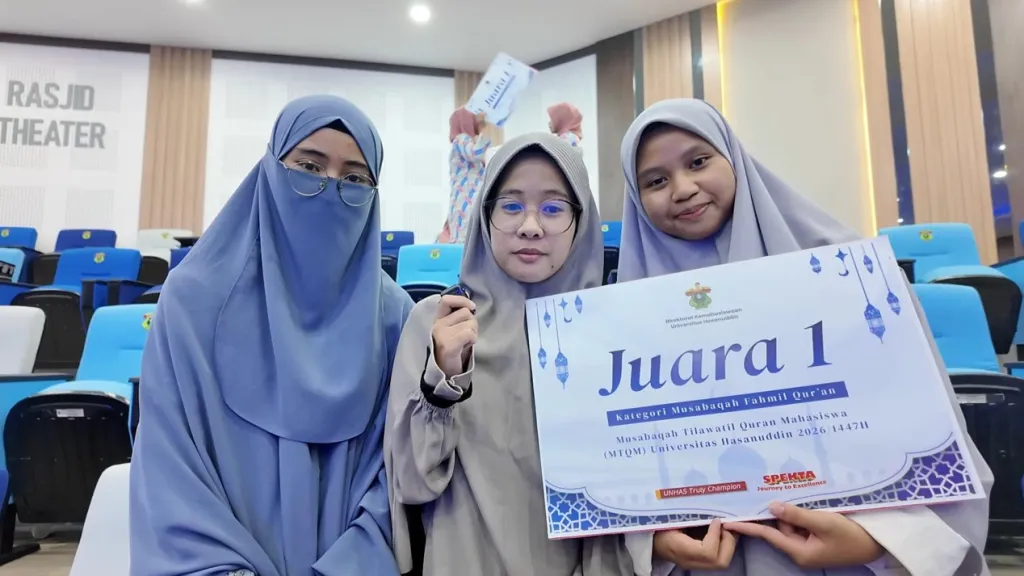 FAHMIL QURAN - Mahasiswa peserta Fahmil Quran di MTQM Unhas dari kiri, Atikah, Al-Haura (tengah), Fauziah (tidak kacamata) usai mengikuti dan dinyatakan juara 1 di Arsjad Rasjid Lecture Theatre, Kampus Unhas, Jumat (6/3/2026). (unhas tv/venny septiani)