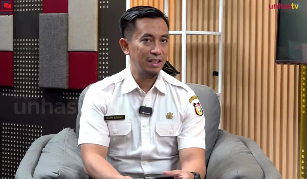 Kepala Dinas Lingkungan Hidup (DLH) Kota Makassar Dr Helmy Budiman SSTP MM saat hadir dalam program Ruang Tengah di Studio Unhas TV, Kamis (11/12/2025). (dok unhas tv)