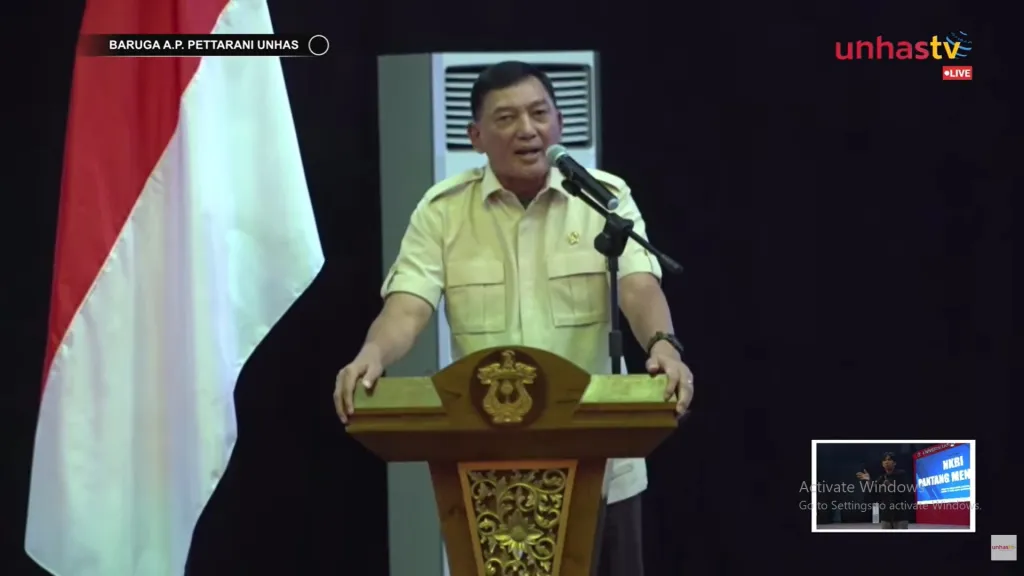 Kuliah Umum Jenderal TNI Purn Sjafrie Sjamsoeddin di Baruga AP Pettarani, kampus Unhas Tamalanrea, Makassar, Selasa (9/12/2025).