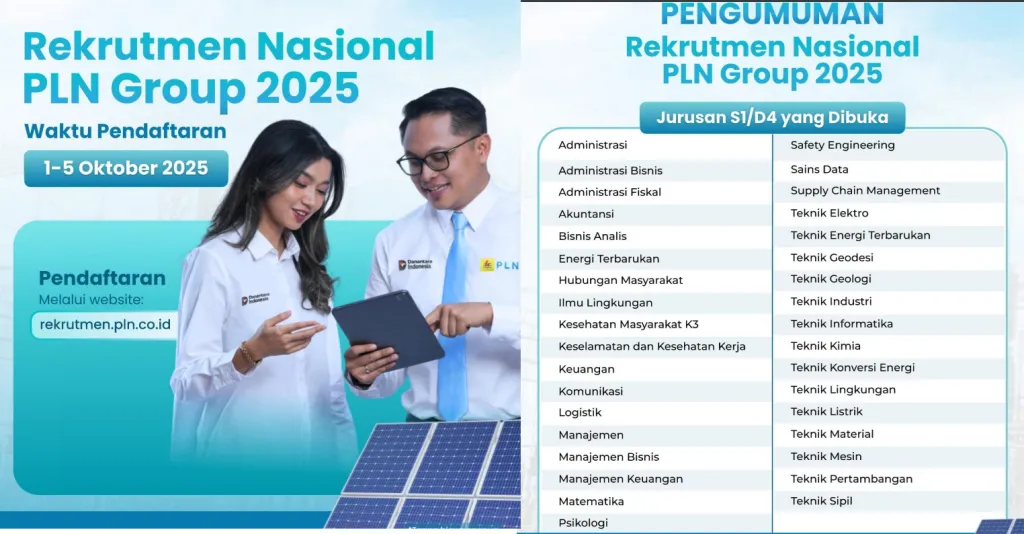 JAKARTA, UNHAS.TV - PT (Persero) Perusahaan Listrik Negara (PLN) kembali membuka kesempatan berkarir bagi putra-putri terbaik bangsa melalui Rekrutmen Umum PLN Group 2025 yang dimulai pada 1 Oktober 2025.