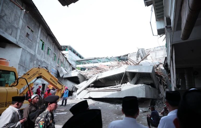 Bangunan musala tiga lantai yang masih dalam tahap penyelesaian ambruk saat ratusan santri sedang melaksanakan salat Asar berjamaah, menewaskan satu santri dan melukai puluhan lainnya. Hingga Selasa pagi ini, proses evakuasi dan perawatan korban masih berlangsung.