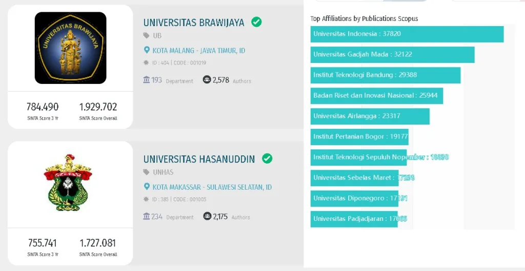 6. Universitas Brawijaya --> 784.490 (SINTA Score 3 Yr), 1.929.702 (SINTA Score Overall)
