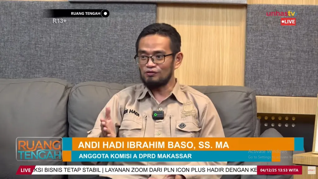 Anggota Komisi A Dewan Perwakilan Rakyat Daerah (DPRD) Kota Makassar, Andi Hadi Ibrahim Baso SS MA saat hadir dalam program Ruang Tengah di Studio Unhas TV, Kamis (4/12/2025). (dok unhas tv)