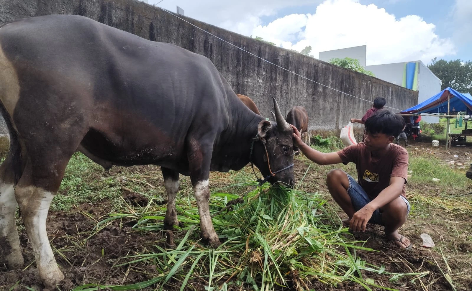 SAPI KURBAN - Seorang pedagang sapi untuk hewan kurban tengah memberi makan hewan peliharaannya di Jl Tun Abdul Razak, Kabupaten Gowa, makin meningkat, Rabu (29/4/2026). (Unhas TV/ Wandi Nojeng)