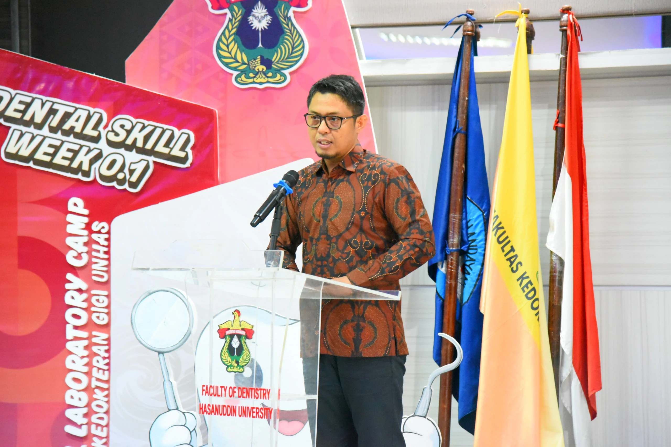 Sambutan selanjutnya disampaikan oleh Dekan FKG Unhas, Irfan Sugianto, drg., M.Med.Ed., Ph.D., Sp.RKG. Dalam sambutannya, Irfan menekankan bahwa penguasaan keterampilan laboratorium merupakan fondasi utama dalam pendidikan kedokteran gigi.