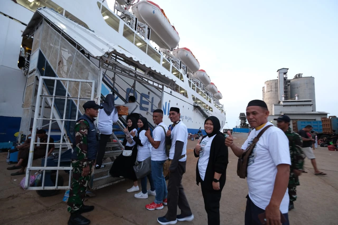 Pemudik program Mudik Aman Berbagi Harapan Tahun 2026 bersama PLN saat hendak menaiki kapal tujuan Surabaya di Pelabuhan Soekarno-Hatta, Kota Makassar, Minggu (15/3/2026). (Dok Humas PLN Sulselrabar)