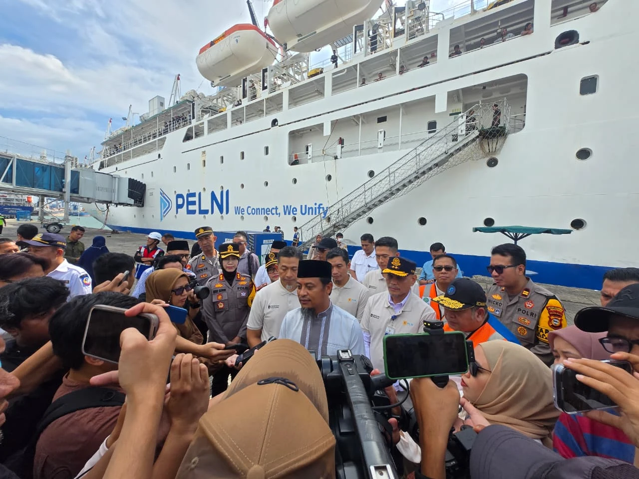 MUDIK GRATIS - Gubernur Sulsel Andi Sudirman Sulaiman bersama General Manager PLN UID Sulselrabar saat sesi wawancara dengan awak media di Pelabuhan Soekarno-Hatta pada Minggu (15/3/2026). PLN melepas peserta program Mudik Aman Berbagi Harapan Tahun 2026. (dok Humas PLN)