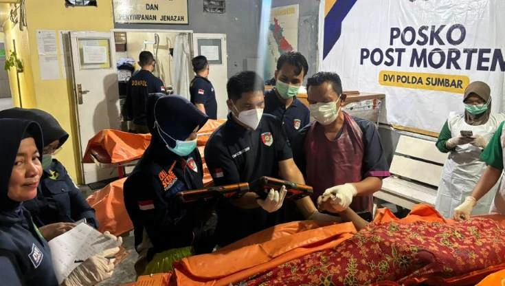 MENINGGAL - Posko Post Mortem Polda Sumbar mengidentifikasi korban bencana alam di Sumatera Barat. Foto: Humas Polda Sumbar